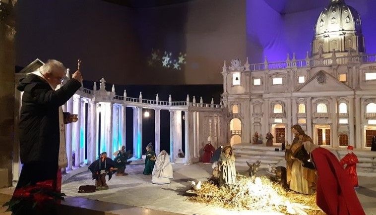 Quest’anno la Natività è ambientata nel contesto di piazza San Pietro, ricostruita insieme al colonnato del Bernini e alla basilica sorta sul Colle Vaticano, nel luogo in cui, secondo la tradizione, san Pietro venne martirizzato. Al centro Maria, Giuseppe e il Bambino; tutt’intorno la piazza popolata di personaggi che richiamano l’attualità: l’artista, la mamma con in braccio un bambino; la giornalista impegnata nella tutela delle donne maltrattate; una suora della congregazione fondata da Madre Teresa.“La basilica si erge maestosa e imponente: la sua architettura è di una bellezza mozzafiato e la sua importanza risiede nell’essere il fulcro della Chiesa visibile, dove tutte le chiese trovano il loro fondamento. Gli uomini in ogni tempo trovano Dio e possono beneficiare della sua presenza proprio nella Chiesa, ma Dio non abita nel cemento e nelle fredde pietre, bensì nella comunità dei fedeli. Gesù è il tempio di Dio e noi cristiani, riuniti nel suo nome, siamo anche noi tempio di Dio, perché Lui è in mezzo a noi. Le pietre vive, che costruiscono la Chiesa, siamo noi”, hanno spiegato gli autori.