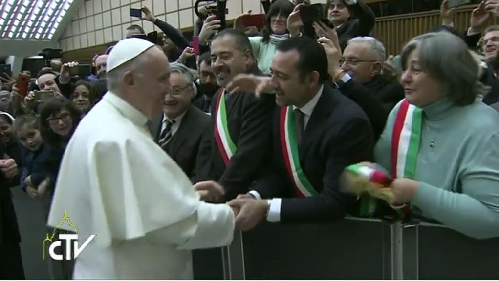 Il Papa ha fatto il suo ingresso in Aula Paolo VI alle 11.15 circa, dove lo attendeva una folla festante in fila ordinata ai varchi d’ingresso fin dalle prime ore di questa mattina. L’udienza con le persone del Centro Italia colpite dai terremoti del 24 agosto, del 26 e del 30 ottobre si è aperta con il «pellegrinaggio», lungo il corridoio centrale, della Croce della Giornata mondiale della Gioventù, portata a spalla da alcuni giovani terremotati. Presenti all’appuntamento con Papa Francesco, oltre ai vescovi delle zone colpite dal terremoto, anche i sindaci dei comuni terremotati di Marche, Umbria, Lazio ed Abruzzo, Vasco Errani, commissario straordinario del governo per la ricostruzione nei territori colpiti dal terremoto, e Fabrizio Curcio, capo del dipartimento della Protezione Civile. Presenti anche rappresentanti dei Vigili del Fuoco e della Sovrintendenza. Papa Francesco si era recato in visita alle popolazioni terremotate il 4 ottobre scorso, invitandole ad «andare avanti» con coraggio, insieme, all’insegna della speranza. Ora un nuovo incontro, scandito dagli abbracci e dai baci ai bambini, protagonisti degli appuntamenti con il Papa, come nelle udienze generali. In sottofondo, un brano tratto da «Forza venite gente» di Michele Paolicelli.