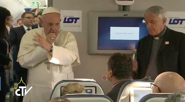 Sul volo di ritorno da Cracovia, per la Giornata mondiale della gioventù e la visita alla Polonia, Papa Francesco ha incontrato i giornalisti e risposto ad alcune domande. E’ così tornato a commentare il barbaro assassinio del parroco francese in Chiesa, durante la messa, compiuto da due terroristi legati all’autoproclamato Stato islamico. “Non si può dire, e credo che non sia vero e non sia giusto, che l’islam sia terrorista” ha detto.