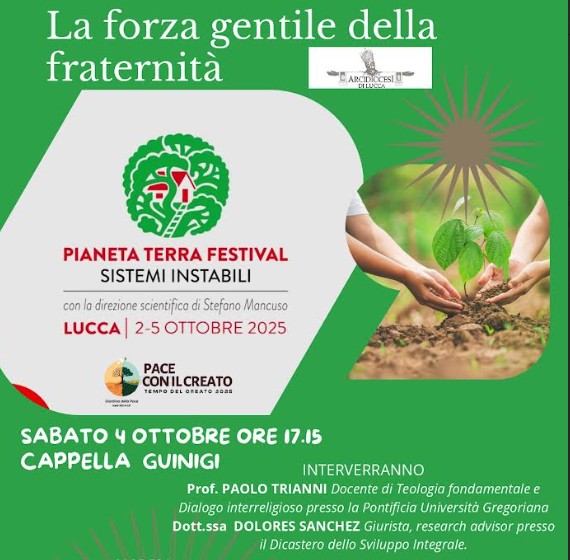 All’interno di Pianeta Terra Festival, alle 17.15 di domani sabato 4 ottobre a Lucca, nella Cappella Guinigi (complesso di San Francesco), si terrà un focus con Dolores Sánchez e Paolo Trianni dal titolo «La forza gentile della fraternità». Sanchez è giurista, dottore di ricerca in diritti fondamentali e protezione ambientale presso la Scuola Superiore Sant’Anna di Pisa ed è consulente senior per la ricerca presso il Dicastero per lo Sviluppo Umano Integrale della Santa Sede. Trianni invece è docente di teologia fondamentale e dialogo interreligioso presso la Pontificia Università Gregoriana, al Pontificio Ateneo Sant’Anselmo, all’Università di Trento e all’Istituto Teologico di Assisi. Insieme offriranno un punto di vista evangelico sull’attuale contesto storico, segnato da instabilità e solitudine. Nel Vangelo secondo Matteo, infatti, leggiamo: «Uno solo è il vostro maestro e voi siete tutti fratelli».